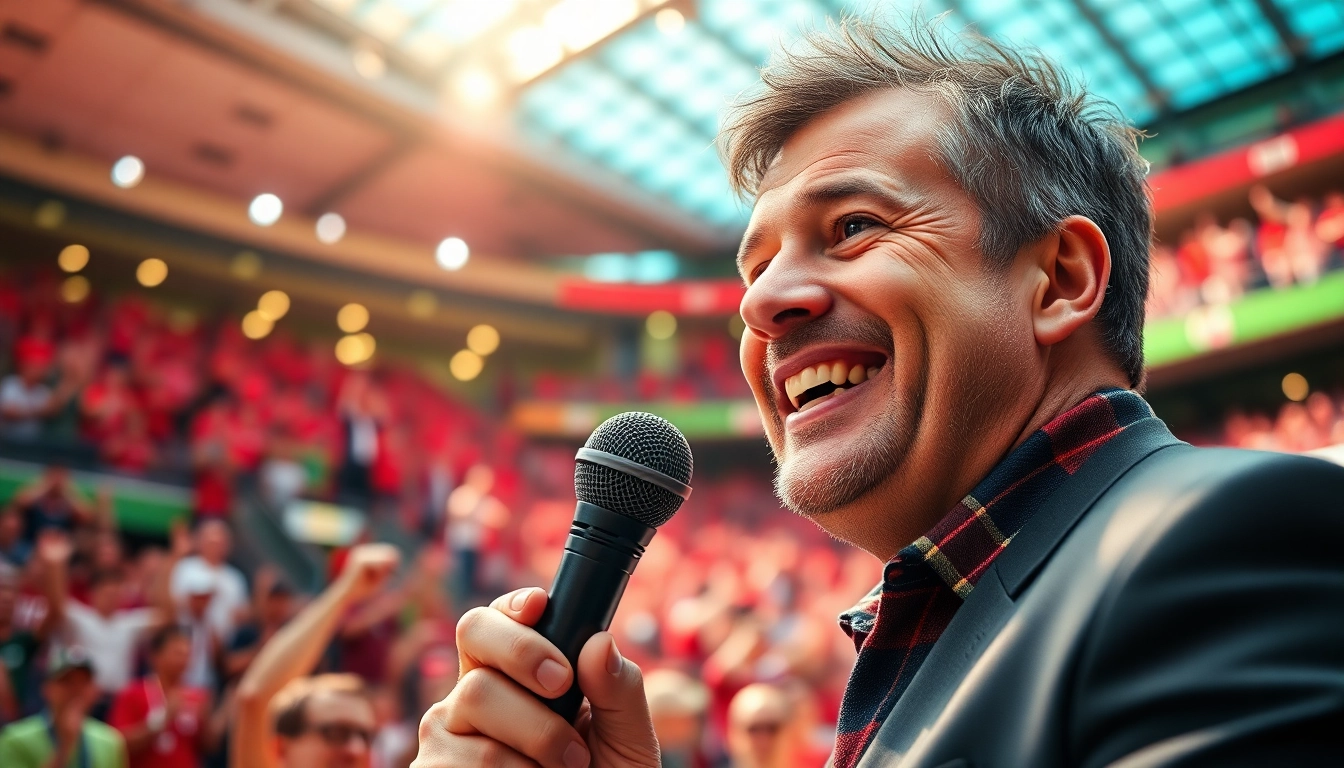 Engaging scene of Sports Broadcasting in a lively stadium, capturing broadcaster enthusiasm.